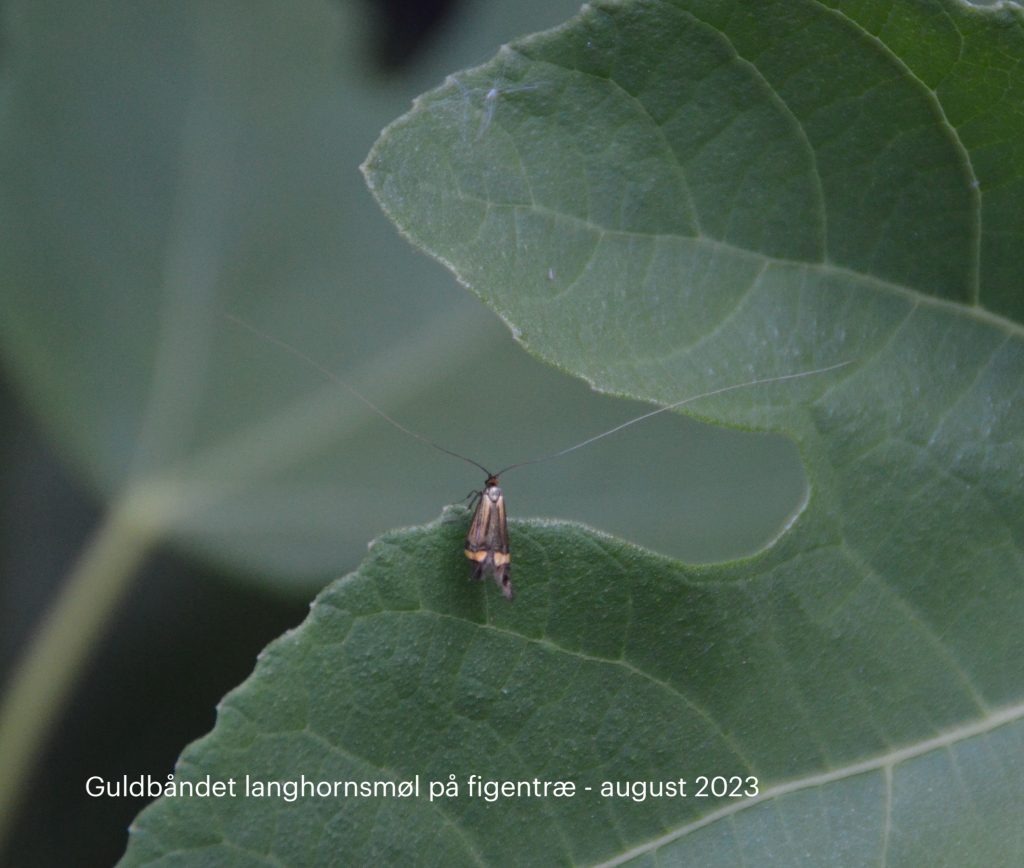 1176. Vers 276. Hvide krukker. Det er meget almindeligt at bruge ordet klokke om en plantes blomsterstand. Så hvorfor ikke også krukker om en liljekonvals blomster? Det er et svagt forsvar, jeg ved det, men udover de berømte bjælder råder sproget kun over botanisk fagterminologi som, bortset fra at den ofte er seksualiseret, faktisk er ret så associationsdød. Så, vi lader denne metafor passere. 1177. Vers 350 ff. Fefølehorn. Svært at retfærdiggøre, men synet af disse langhornsmøl er så enestående og anderledes, at jeg slog mig selv over fingrene og gjorde det alligevel: greb tilbage til et af den vestlige kulturs mest benyttede metaforer for ideen om det overjordiske, det tryllebundne. Hvis der er nogen, som herefter syntes, at disse møl er væsner, der fortjener vores respekt, så har jeg ikke digtet forgæves. Se nedenfor et foto fra haven af en anden art: guldbåndet langhornsmøl. (Specifikt om vers 355-57: elevator og maskinmetafor. Endnu et eksempel på et digt, der går i slagsmål med sig selv over sine metaforer. Metaforen "elevator" erstattes med "snoretræk", hvilket blot er at erstatte en højteknologisk maskine med en lavteknologisk indretning; en feberredning. Formålet er her at illustrere, hvor svært det er at gøre sig fri at et antropocentrisk ord- og billedvalg og hvor svært det er at afkolonialisere sit sprogbrug. To points for at gøre forsøget).