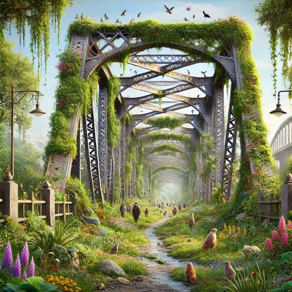 *) Billedet Den gamle lillebæltsbro som faunapassage er computergenereret og lavet som illustration til vers 1612 ovenfor om hvordan den gamle jernbanebro skal omdannes til park og faunapassage og hvordan vi lægger frø ud langs de gamle jernbanespor og ser træer vokse ud gennem gitterværket.