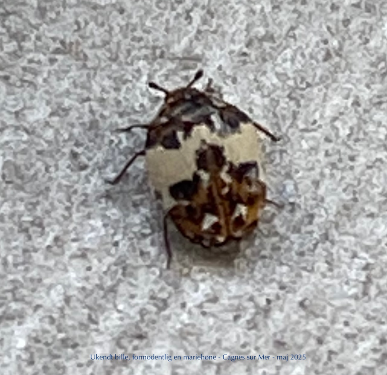 2118. I bruserummets vindueskarm En bille brun og sort i hvidt: Jeg rækker efter min mobil, Og mit håndklæde, en famlen, Ta’r fotos, drypper, grubler, Uvant biotop for mig her På 2. sal på Côte d’Azur.